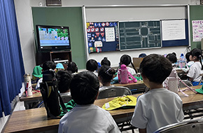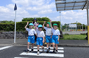 DVDを視聴して交通安全について学び、公園内で実践!しっかりと手をあげて横断歩道を歩く姿がかっこいいです。