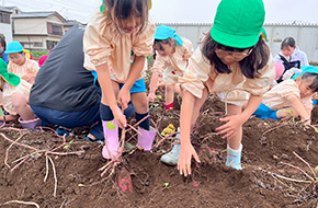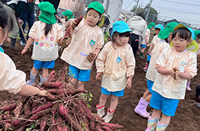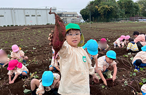 年長さんが昨年植えたさつまいもが収穫となりました! 大きく立派なさつまいもから小さくコロコロかわいいさつまいもまで大豊作となりました☆ 手も顔も真っ黒になりながら掘る子どもたちの表情はとても真剣でどんな食べ方をするのか、相談し合っている姿が見られました。